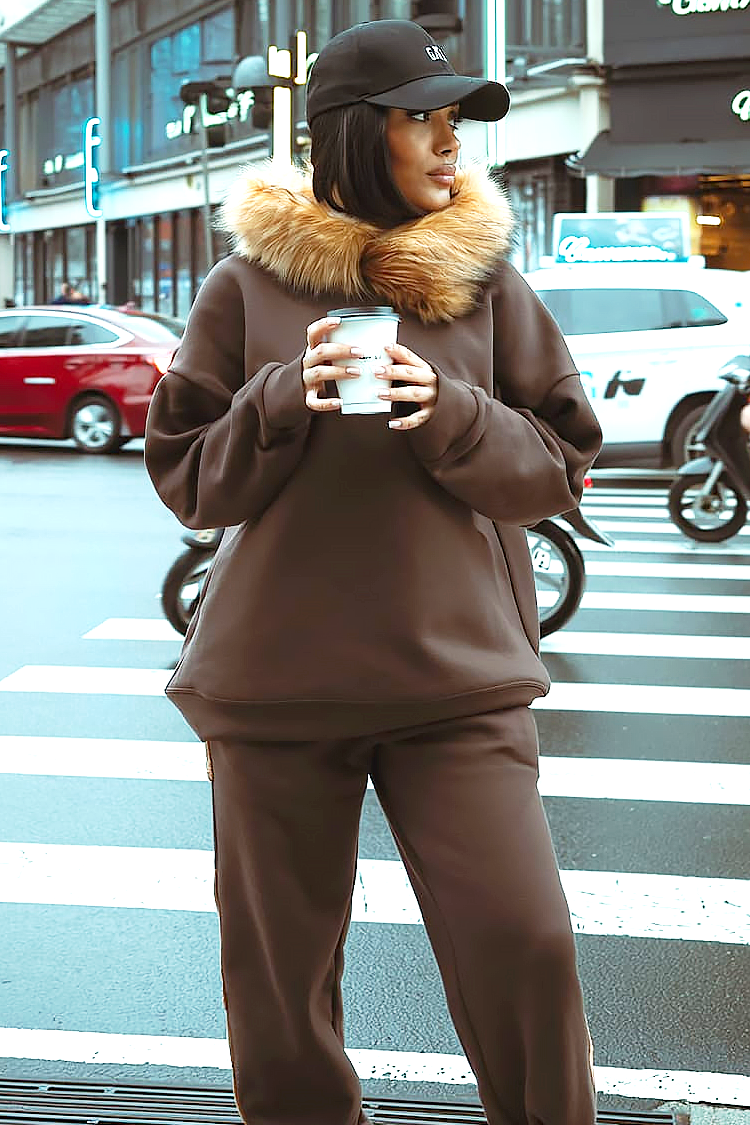 - Комплектът се състои от блуза с атрактивен дизайн и ефектна яка с пух, съчетана с панталон със свободна и елегантна кройка.