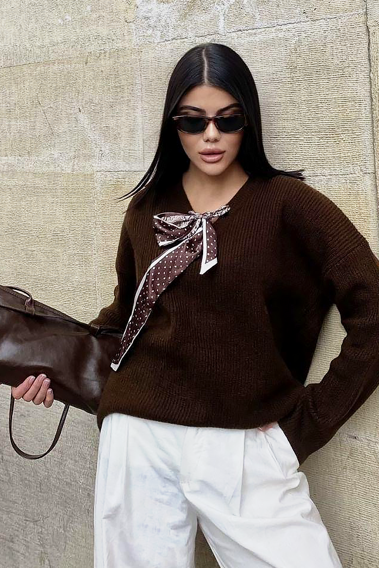 • Практичен пуловер с атрактивен дизайн и едноцветен десен.