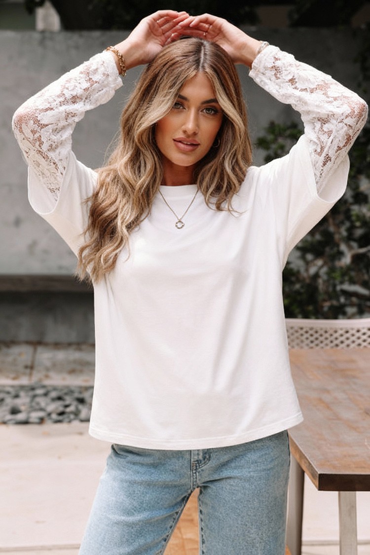 - Моделът е комбинация от широка тениска и ефектни, дълги ръкави от дантела.