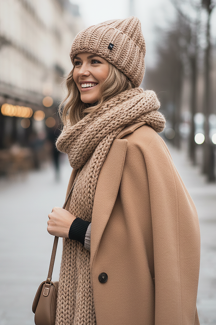 - Допълнете вашия аутфит с комплект от две части – шапка и шал с едноцветен десен.