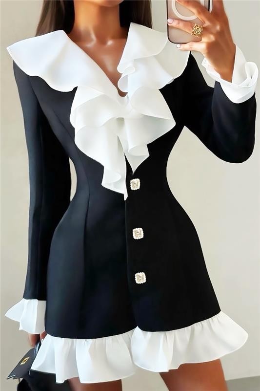 • Моделът е с вталена и класическа кройка, дълги ръкави, стилни  копчета и ефектни бели волани.