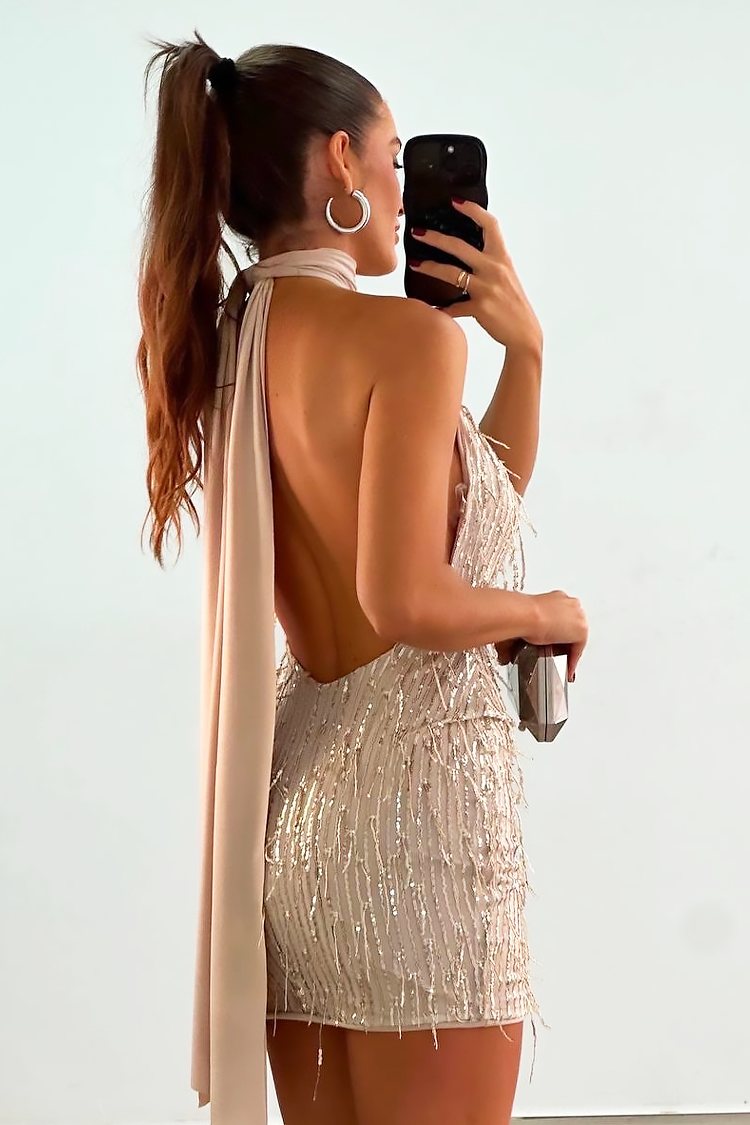 - За перфектната парти визия се доверете на тази рокля с атрактивен, блестящ дизайн.