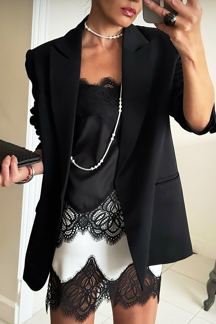 - Полата е с къса дължина, двуцветен десен и дантела, а топът е с тънки презрамки и секси деколте.