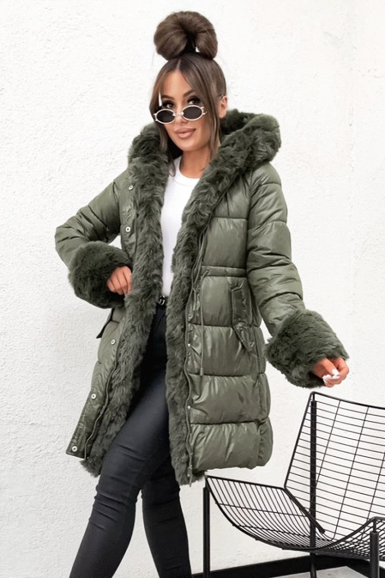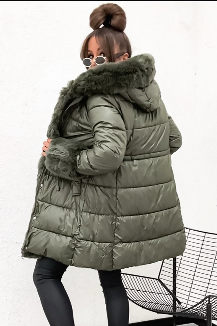 - Моделът е с качулка, пух, удобни джобове и връзки на талията.