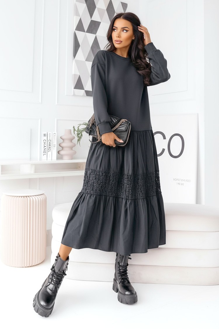 - Роклята е с дълги ръкави, разкроена и комфортна кройка и е подходяща за всеки тип фигура.