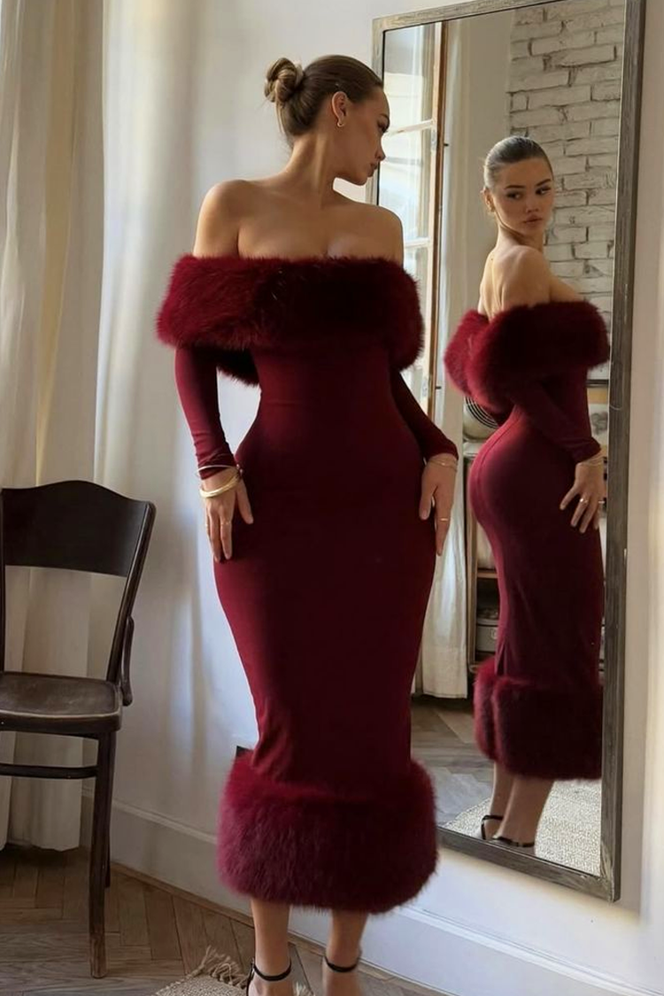 - Моделът е със секси кройка по тялото, паднали рамене, ниска цепка в задната част и мек пух за акцент.