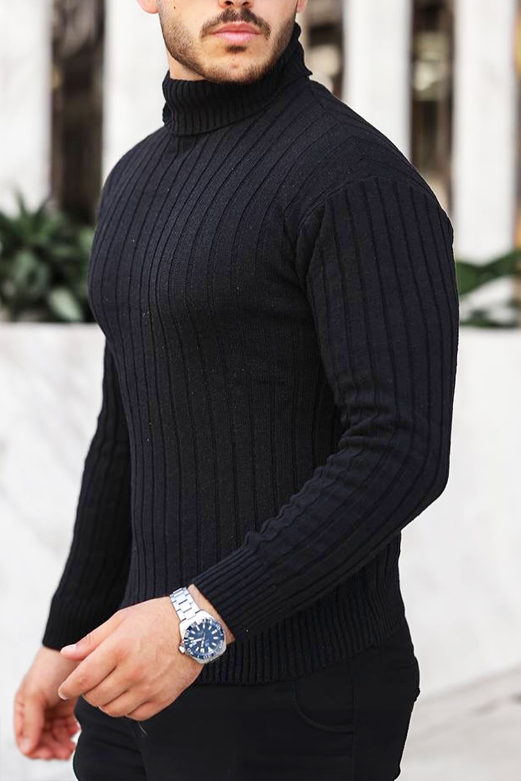 - Удобен мъжки пуловер с поло яка и вертикален рипсен десен в черен цвят, подходящ за различни модни съчетания.