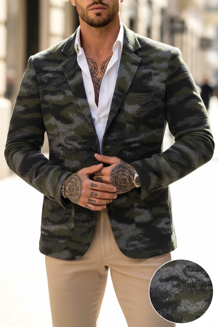 - Стилно мъжко сако с актуален камуфлажен десен, подходящо както за ежедневна, така и за елегантна визия.