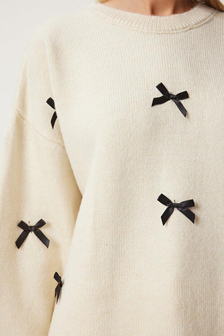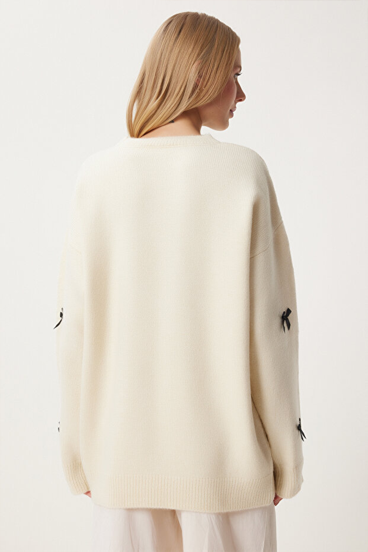 - Моделът е с класическа овърсайз кройка, обло деколте и панделки по цялата дължина.