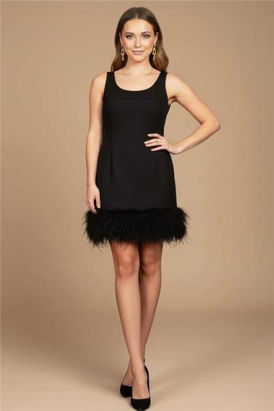 - Моделът е със секси и ефектна кройка, класическо обло деколте и атрактивен пух по краищата.
