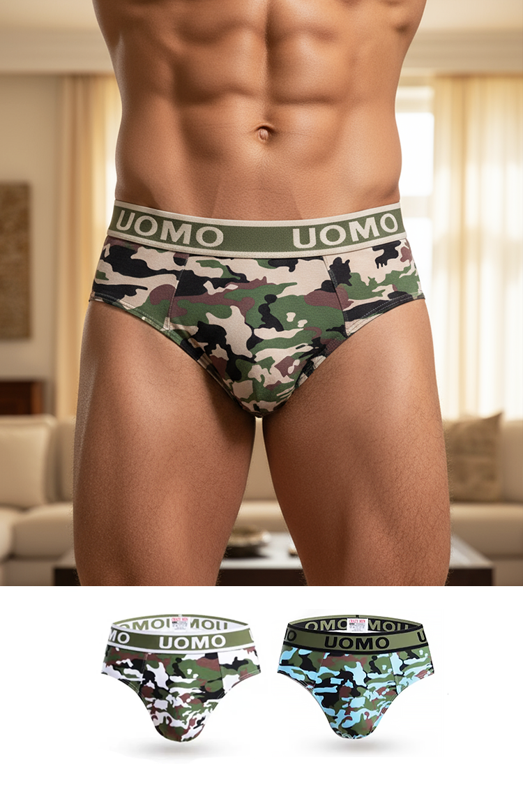 - Комплект от три броя мъжки слипове с камуфалжен десен, изработени от памучна, дишаща материя.