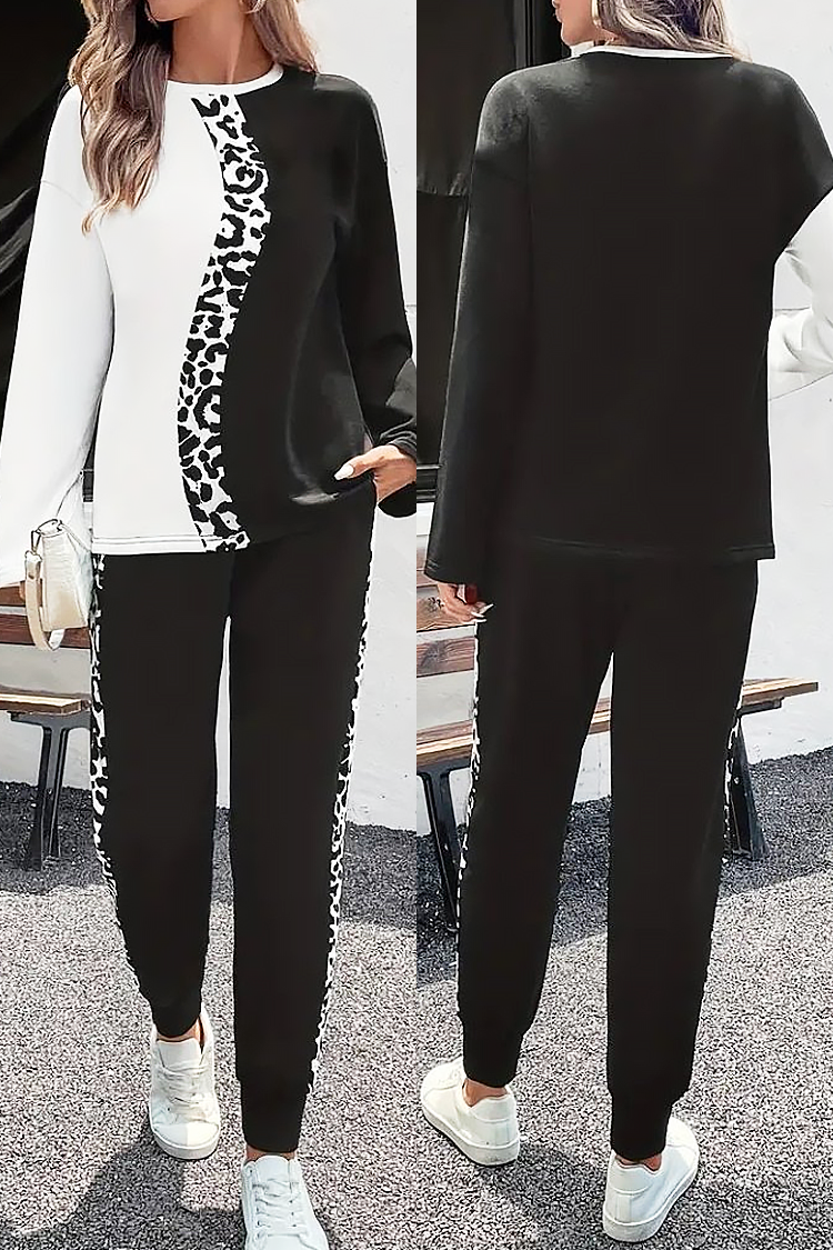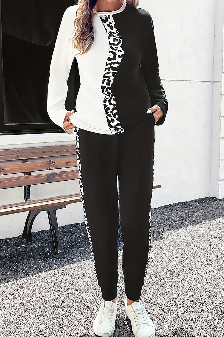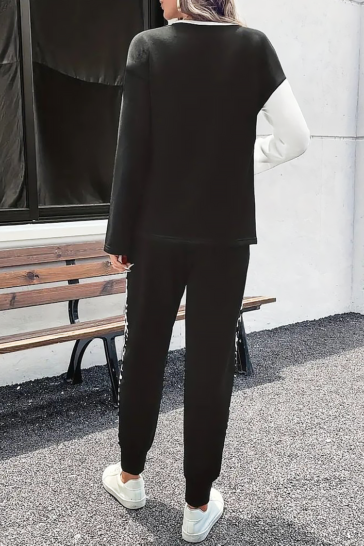- Суичърът е със свободна кройка и обло деколте, а панталонът - с висока талия и ластик в края на крачолите.