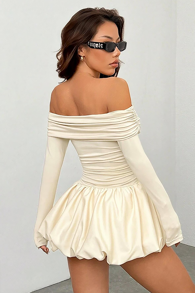 • Моделът е с кройка по тялото и се носи с голи рамене.