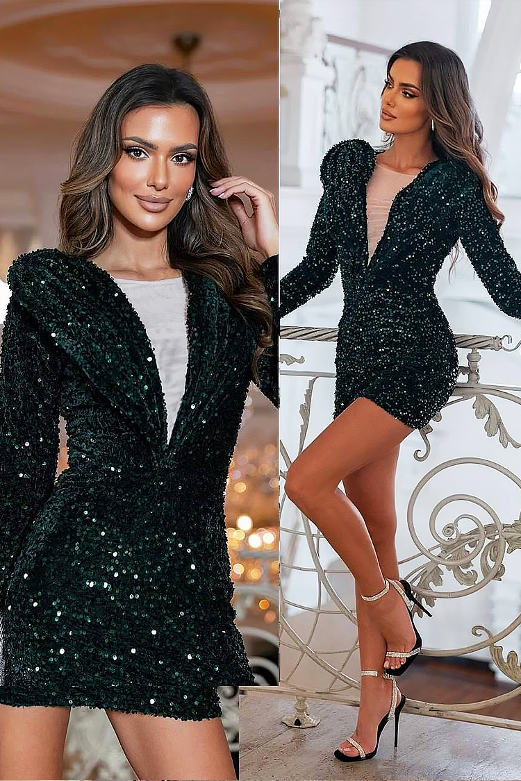 - Моделът е с вталена кройка, дълги ръкави, пайети и секси деколте с тюл.