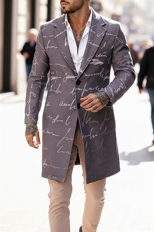 • Елегантно мъжко палто с оформящ силует и ефектен, ръкописен принт.