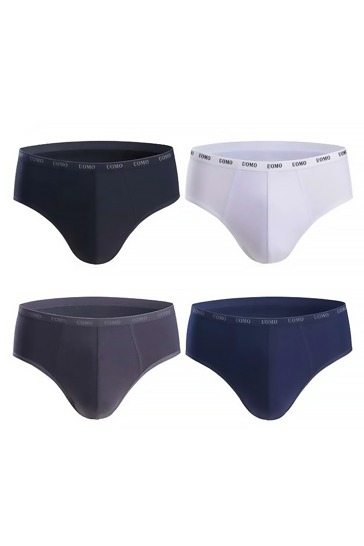 - Комплект от четири броя мъжки слипове с едноцветен десен и ластик с надпис, изработени от памучна, дишаща материя.