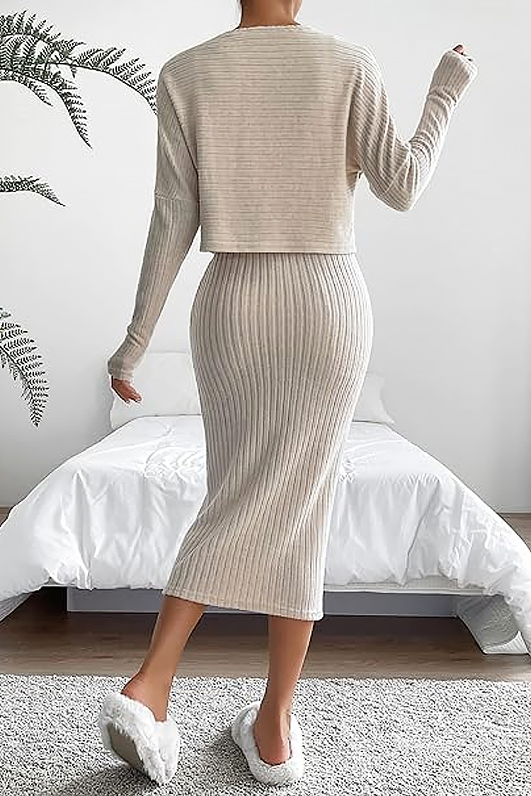 • Пуловерът е със свободна кройка, а полата е с миди дължина.