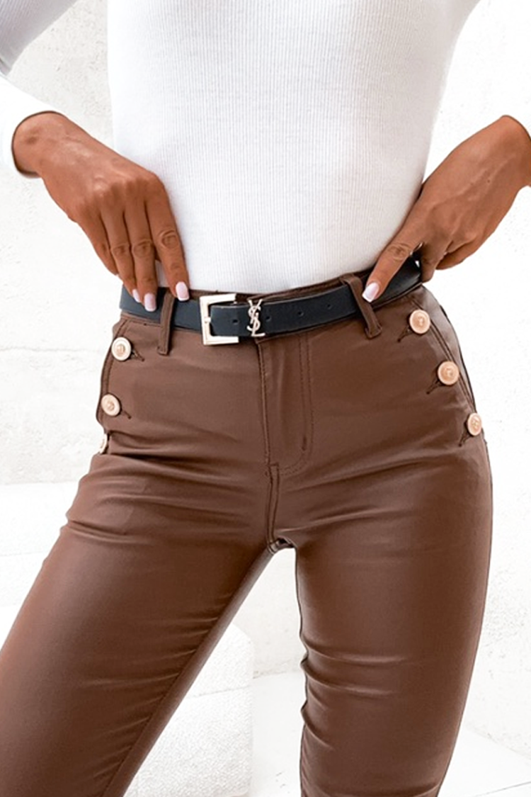 • Моделът е с висока талия с връзки и странични джобове с копчета.
