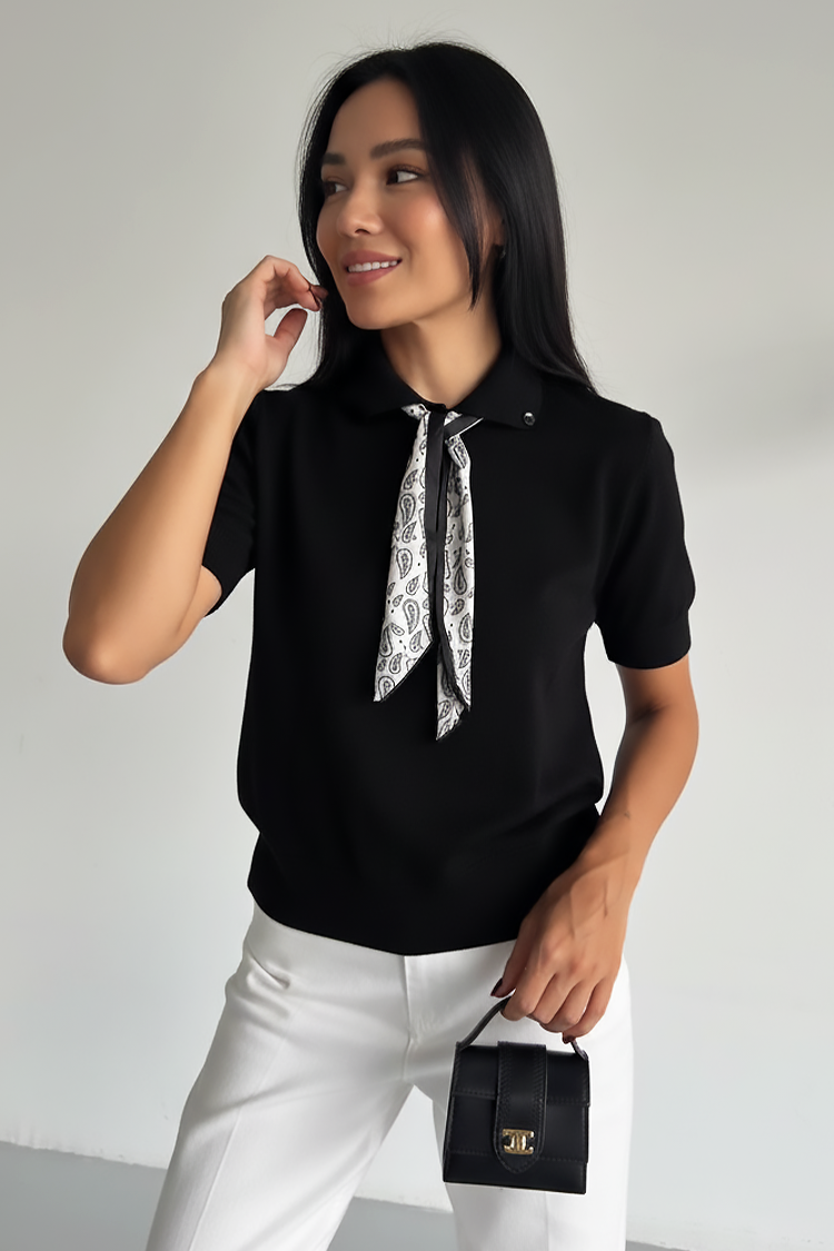 - Моделът впечатлява с елегантна кройка, стилна яка, къси ръкави и декоративно шалче.