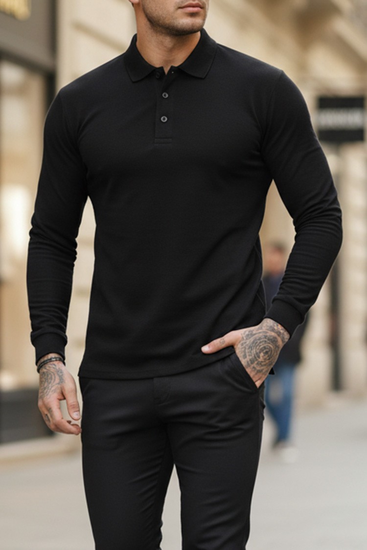 - Спортно-елегантна мъжка блуза с яка, деколте с копчета и ръкави с прибрани маншети, подходяща за ежедневието.
