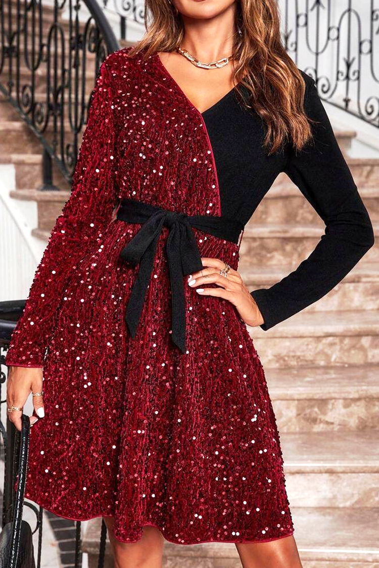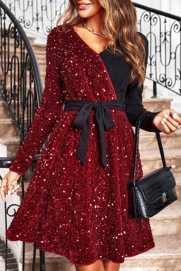 - Моделът е с двуцветен дизайн, пайети и текстилен колан.