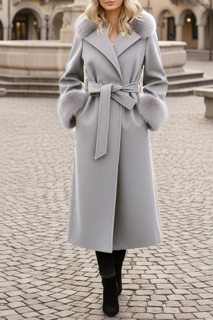• Моделът е с класически дизайн, колан от същата материя и обемна пухена яка с маншети.