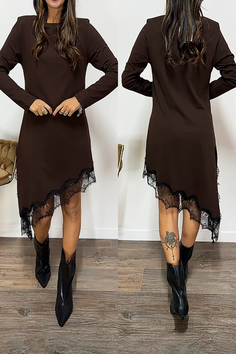 - Моделът е с асиметрична кройка и нежна дантела в долната част.
