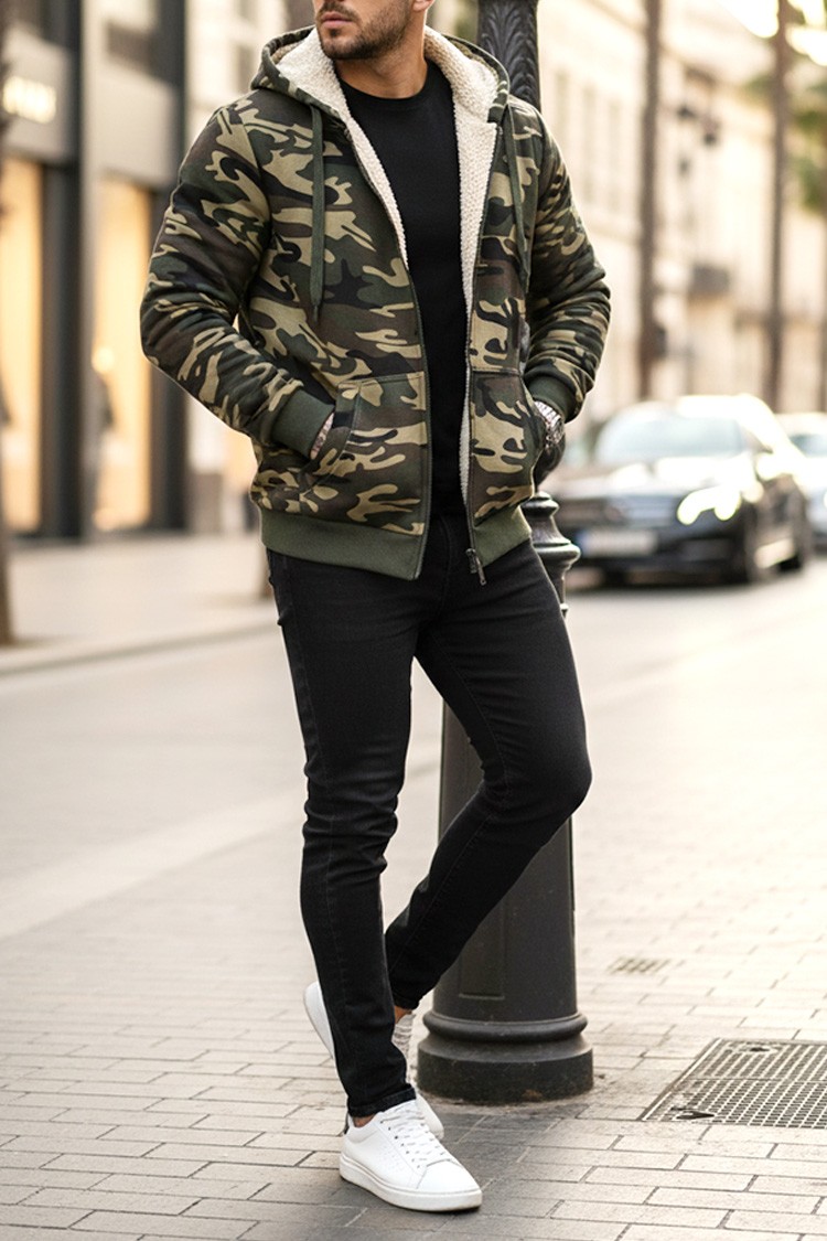 • Практичен и удобен мъжки суичър с камуфлажен десен и пухкава подплата, подходящ за ежедневието.