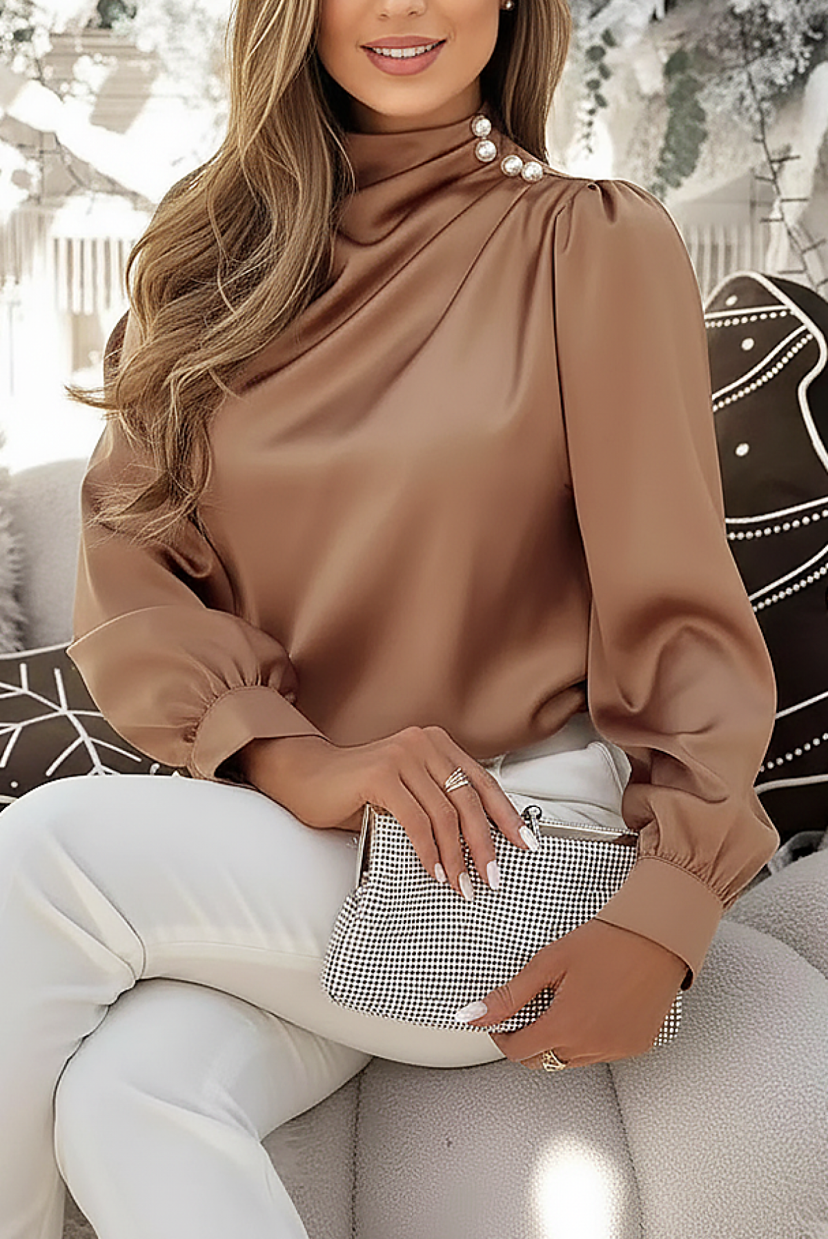- Блузата е с дълги ръкави, елегантна кройка и декоративни перли на рамото.