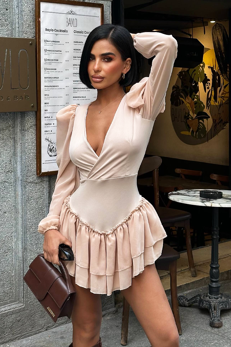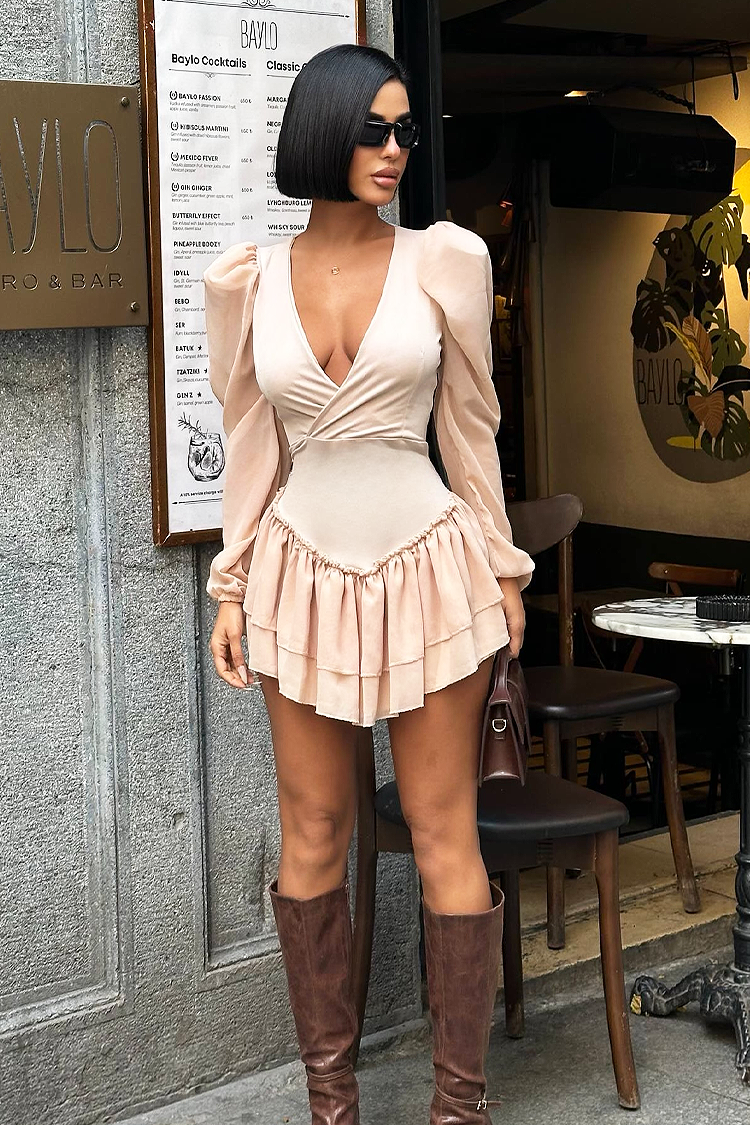• За перфектната визия, изберете тази къса рокля с атрактивен дизайн в бежов цвят.