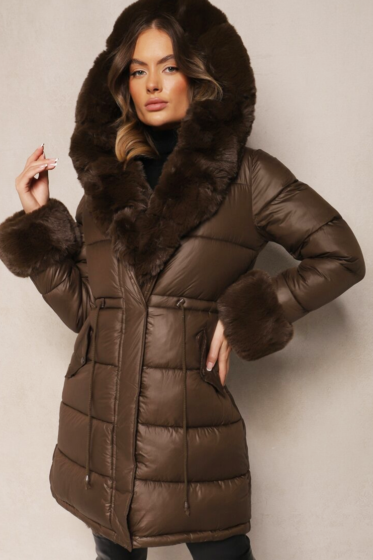 - Моделът е с ластична талия с регулируеми връзки, практична качулка и странични джобове.