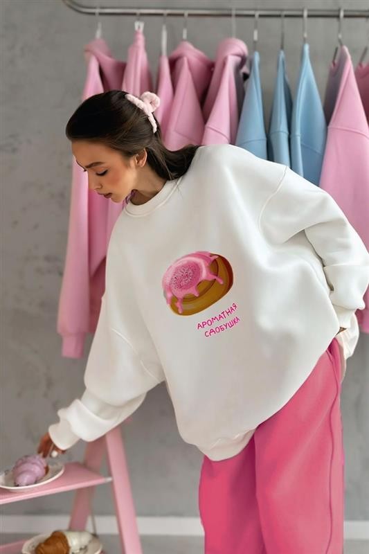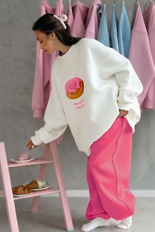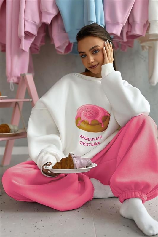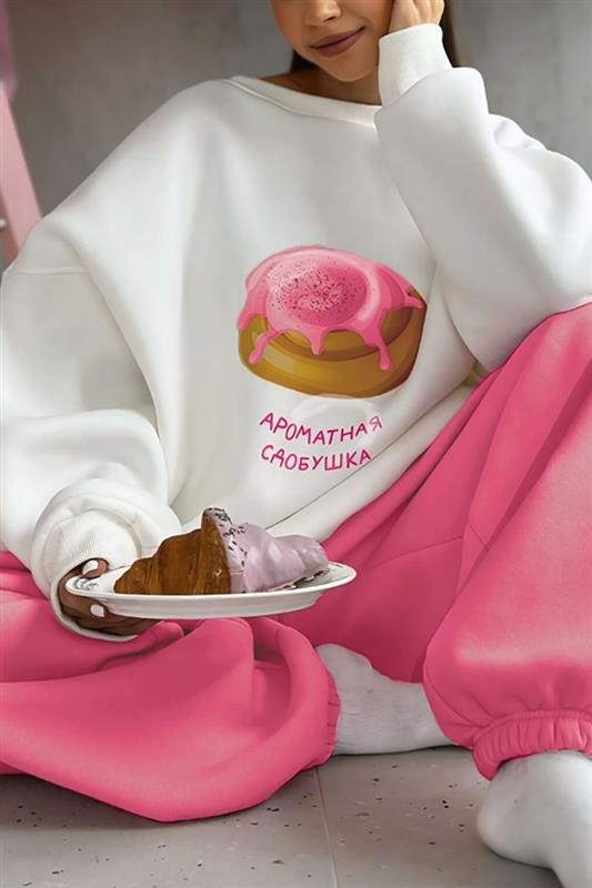 - Комплектът се състои от овърсайз блуза с атрактивен принт, съчетана с панталон със свободна и комфортна кройка.
