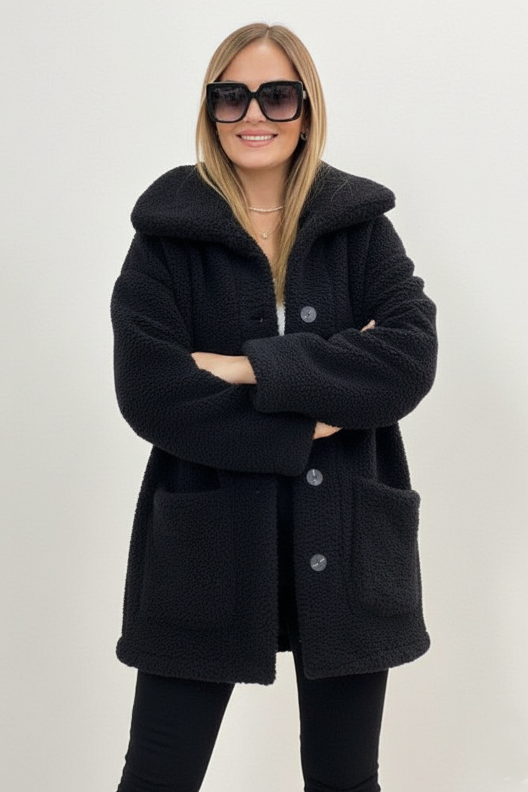 - Моделът е с класически дизайн, практични джобове, обемна яка и копчета отпред.