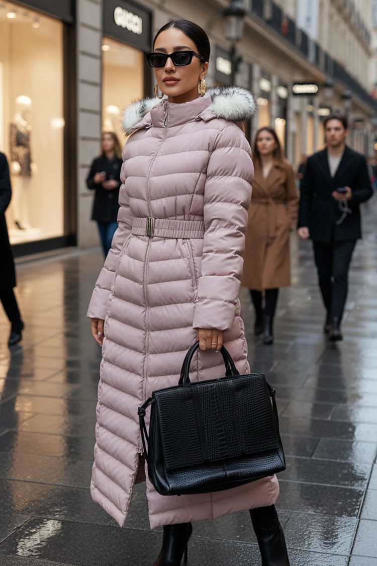 - Моделът е със свободна кройка, практична джобове и ефектен колан и качулка с пух.