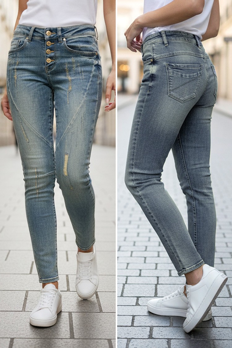 - Разнообразете гардероба си с дънки в светлосин цвят с избелен ефект и декоративни шевове, подходящи за ежедневието.