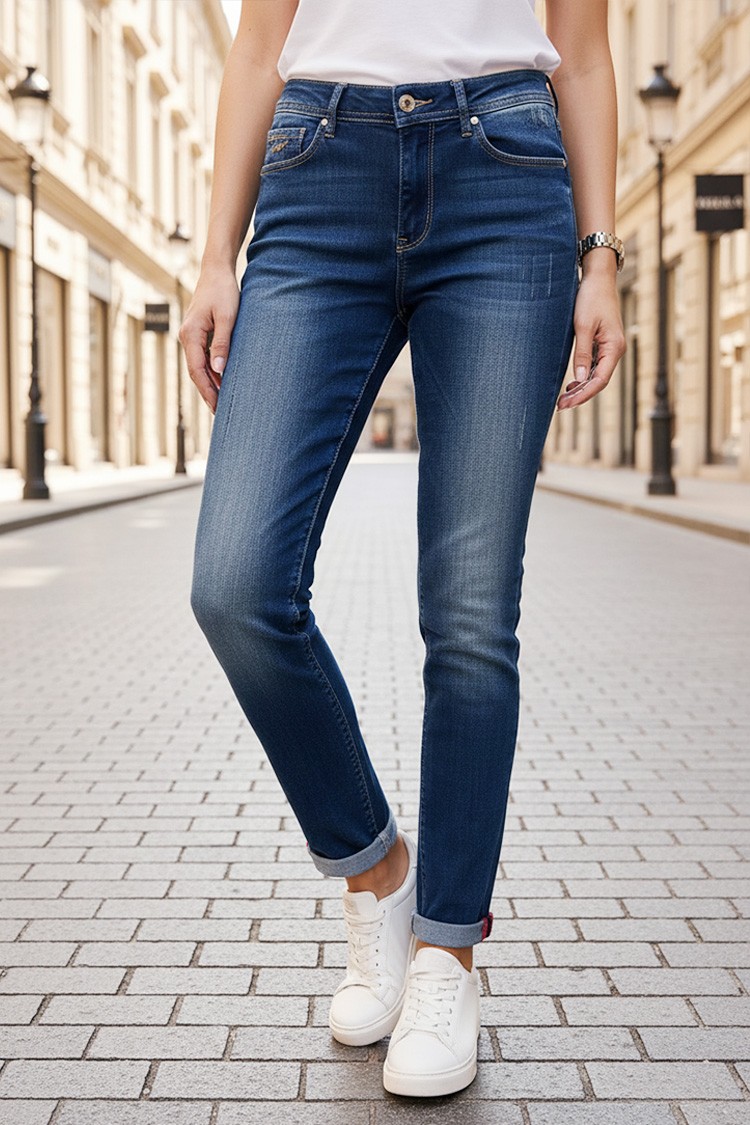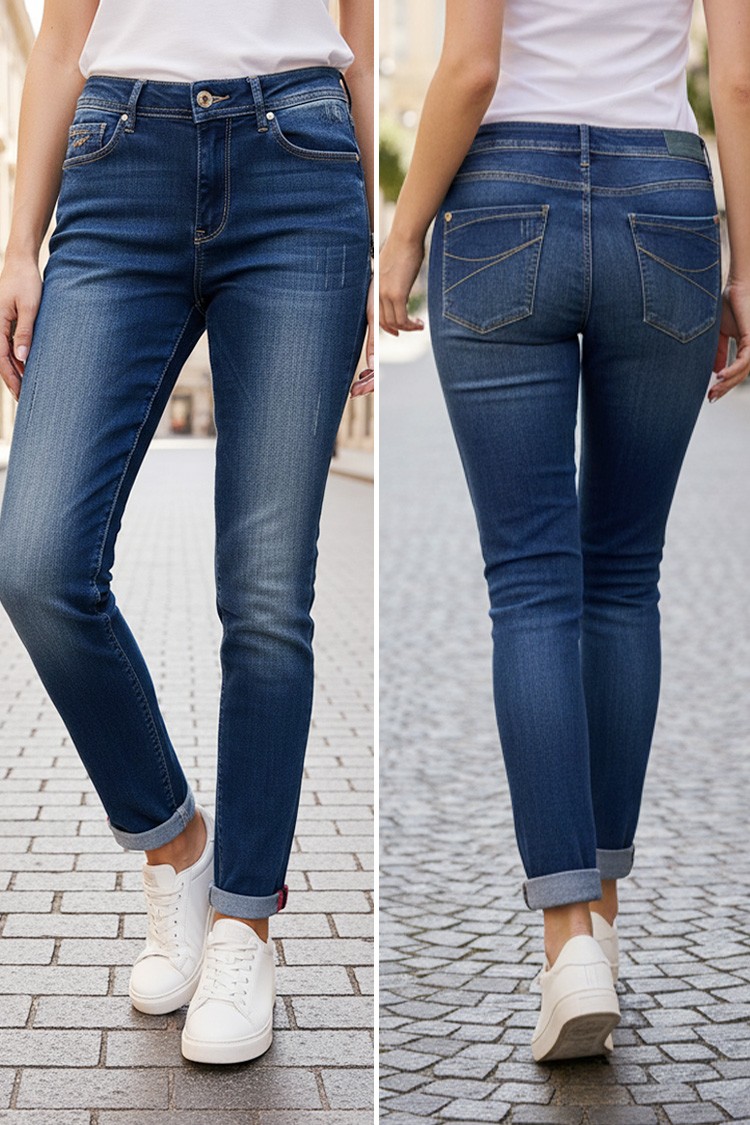 - Разнообразете гардероба си с практичен модел дънки в тъмносинсин цвят с декоративни прокъсвания, подходящи за ежедневието.