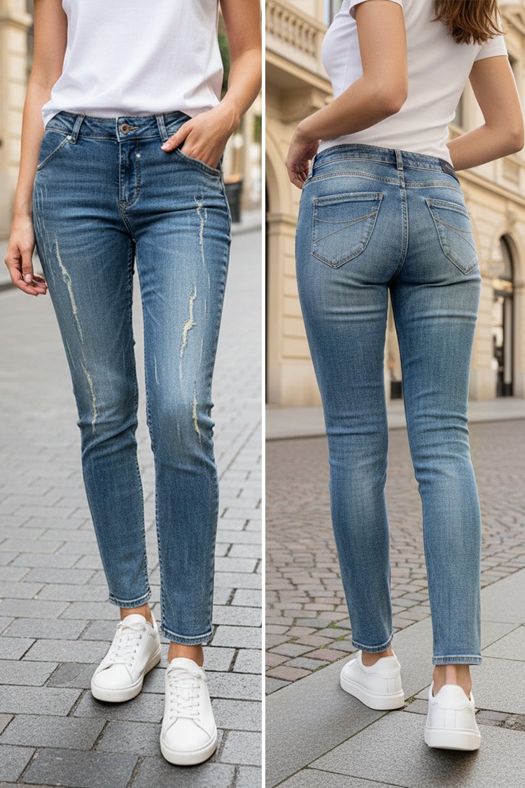 - Дамски дънки с декоративни прокъсвания и избелен ефект, подходящи за ежедневието или разходка.