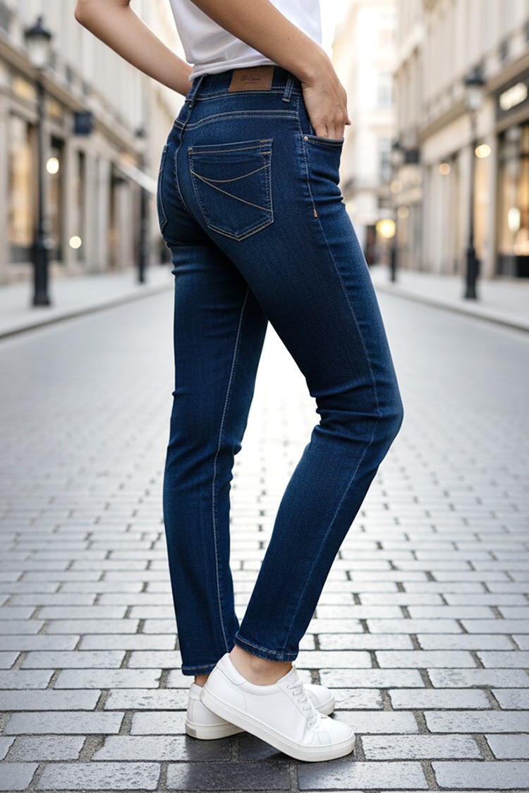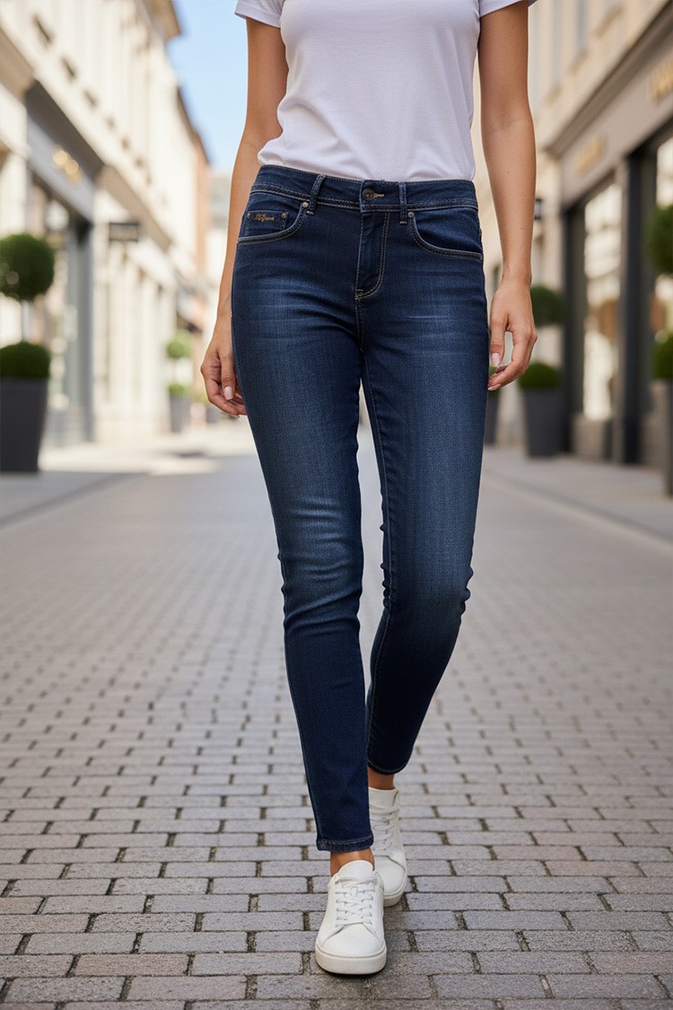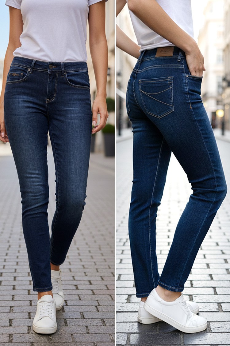 • Изчистен модел дамски дънки в тъмносин цвят, подходящи за ежедневието или разходка.