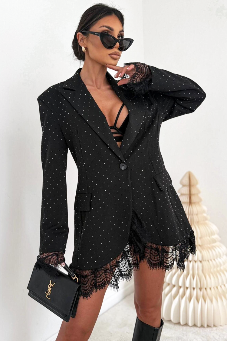 • Моделът е с прецизна кройка по тялото, копче отпред, ефектни детайли от дантела по краищата и блестящи детайли.