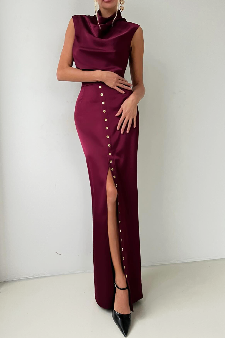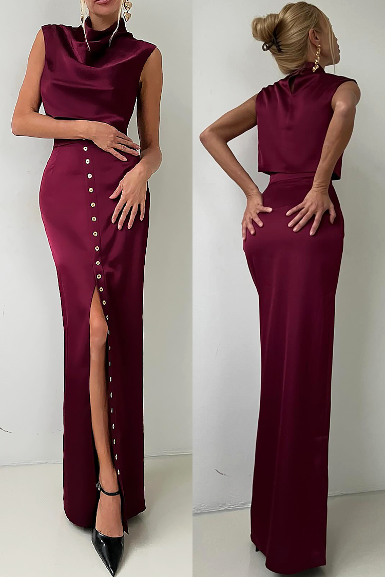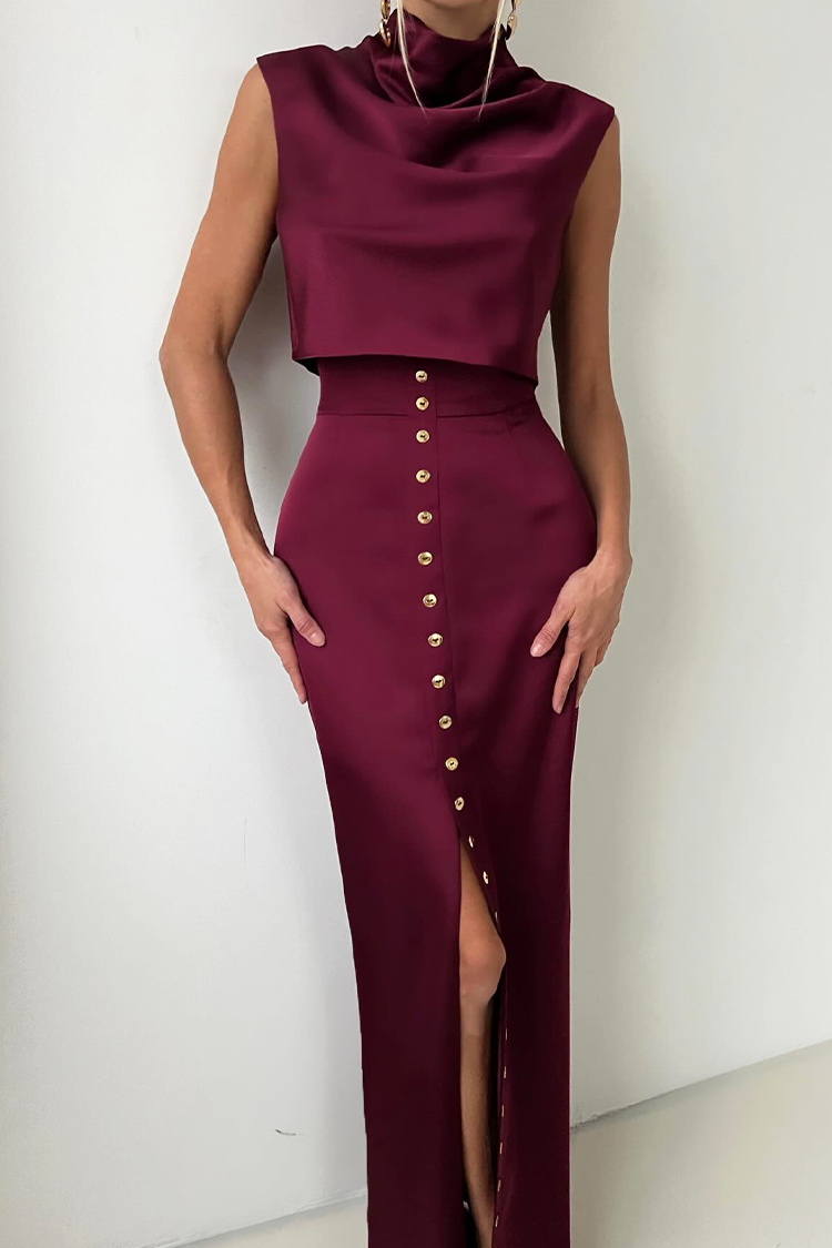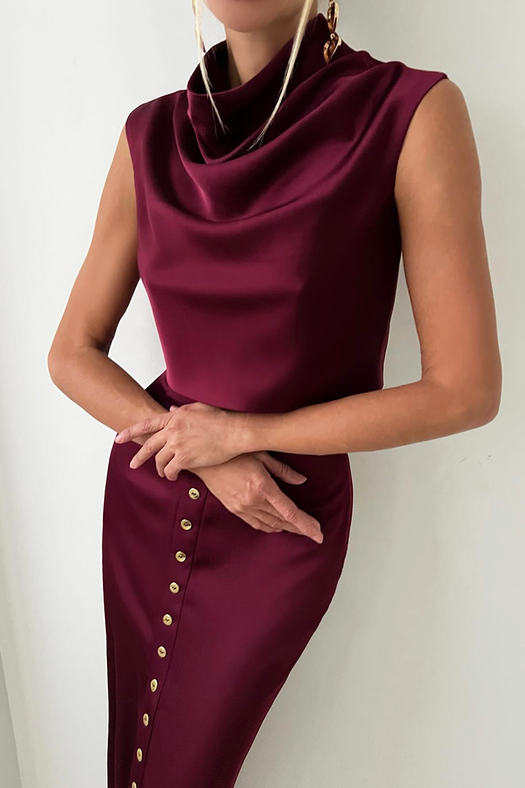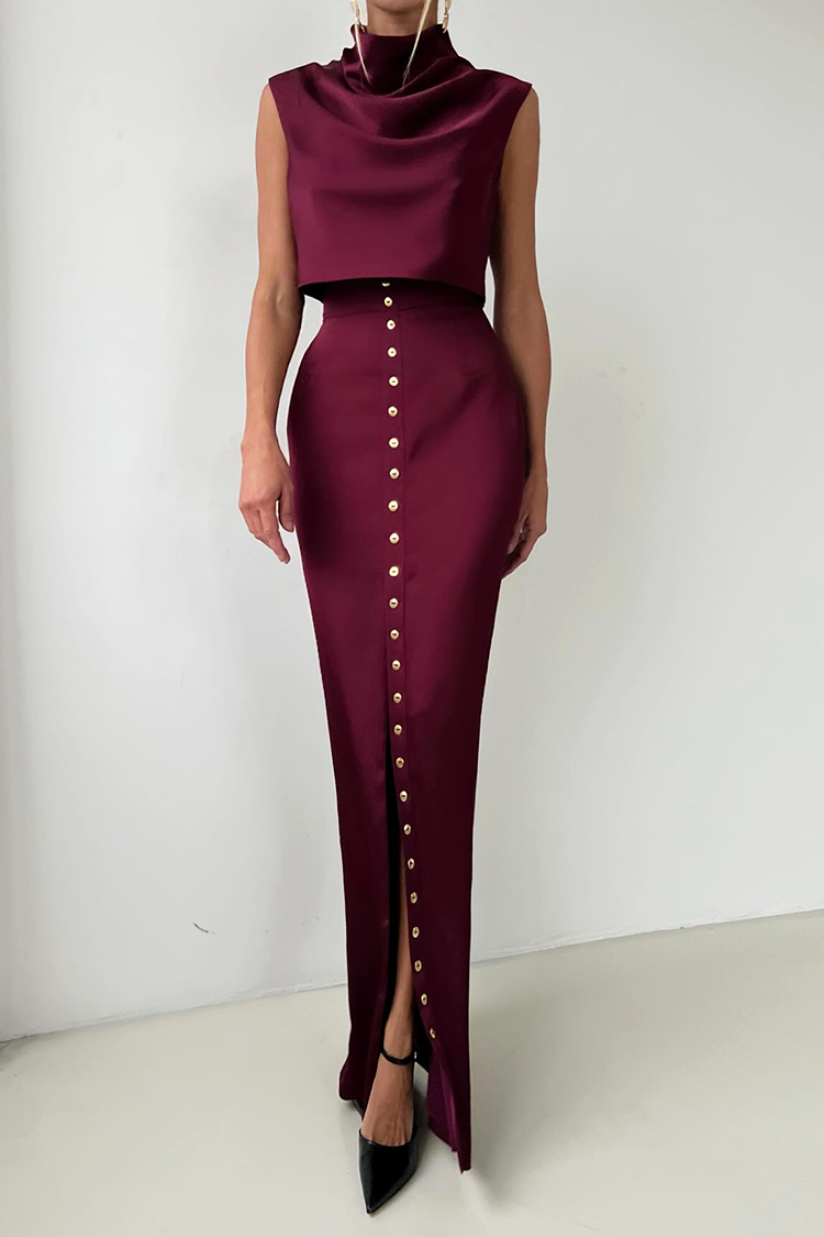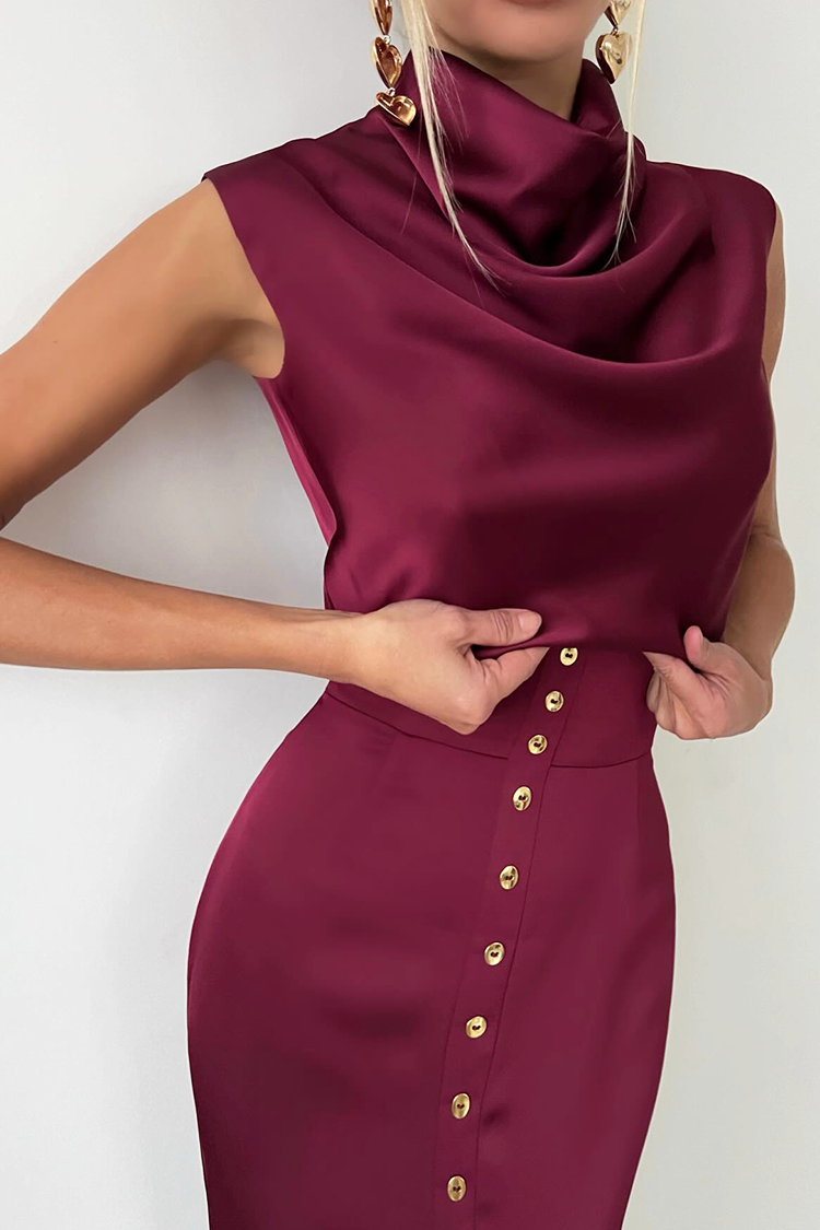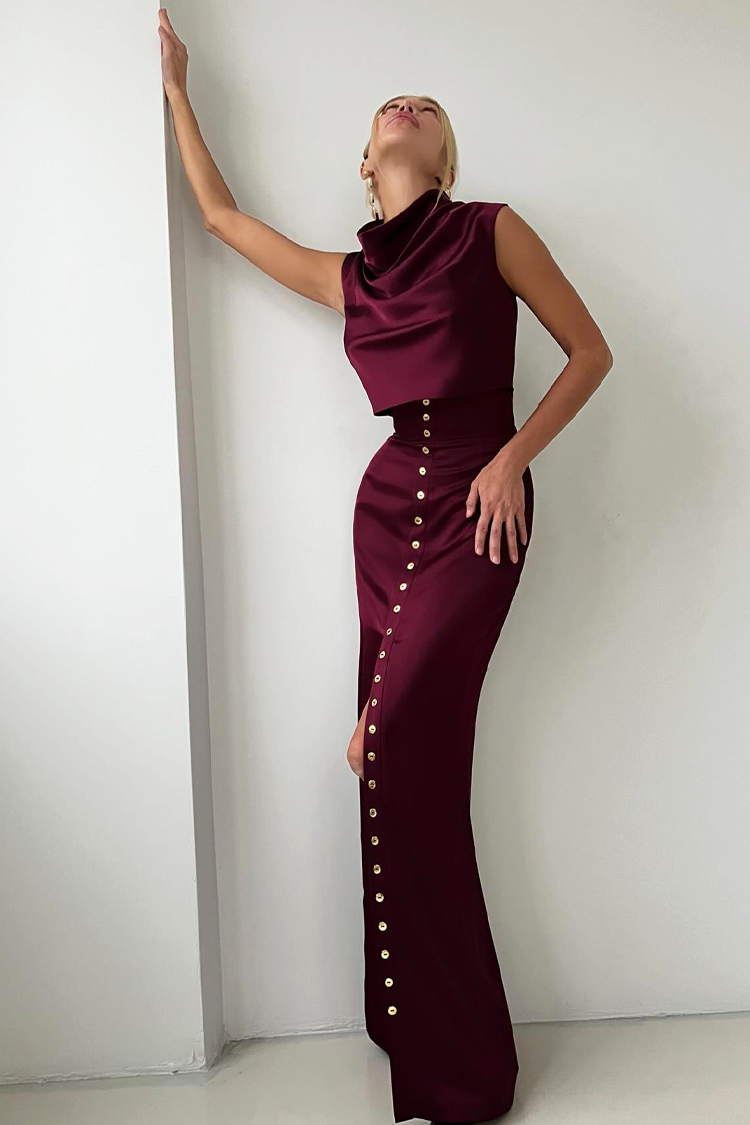 - Полата е с висока талия, права кройка и копчета по дължината, които позволяват да се носи и с цепка.