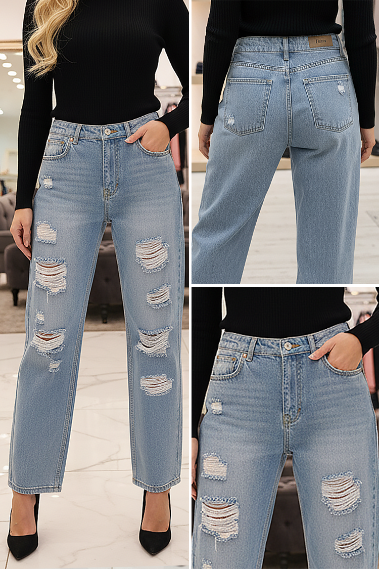 • Моделът е с висока талия, джобове, свободна кройка, модерен разкъсан ефект и светлосин десен.