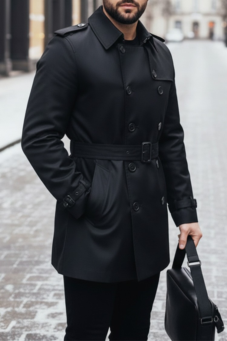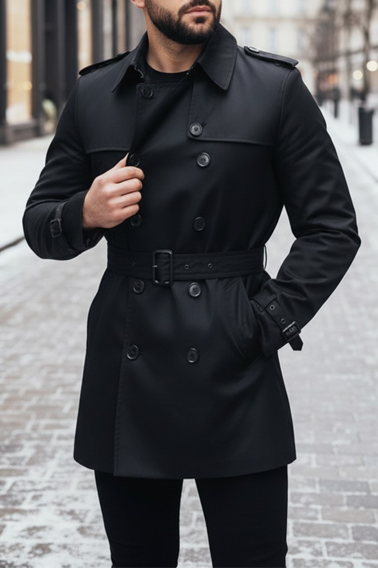 • Стилен тренчкот с яка и колан в черен цвят, който трябва да притежавате в гардероба си.