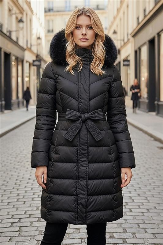- Моделът е със свободна кройка, дълга дължина, практични джобове и качулка с пух.