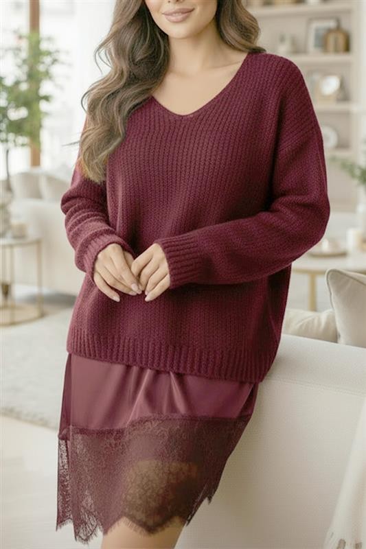 • Моделът е със свободна кройка, класическо деколте и комбинирана материя с дантела по краищата.
