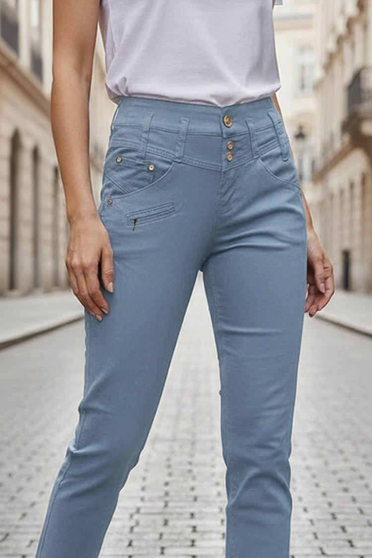 • Панталонът е с висока талия за перфектно прилягане и оформяне. Моделът се закопчава чрез копчета.