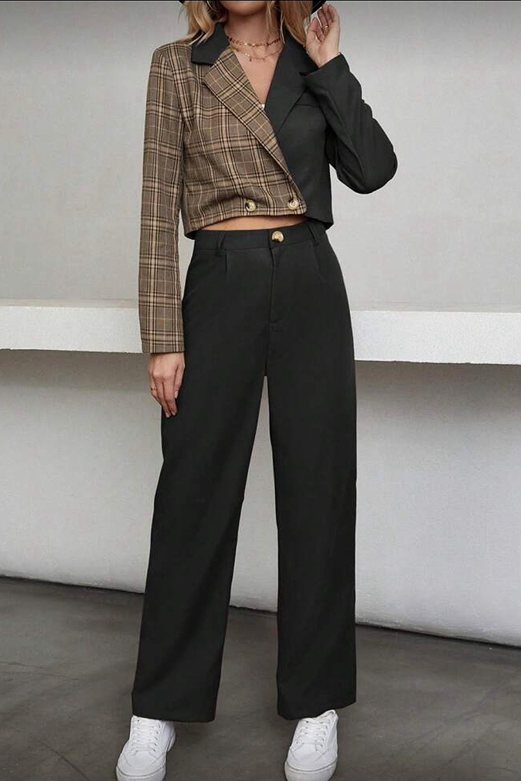 • Панталонът е с висока талия и широки крачоли, а сакото с кроп кройка и атрактивен десен.