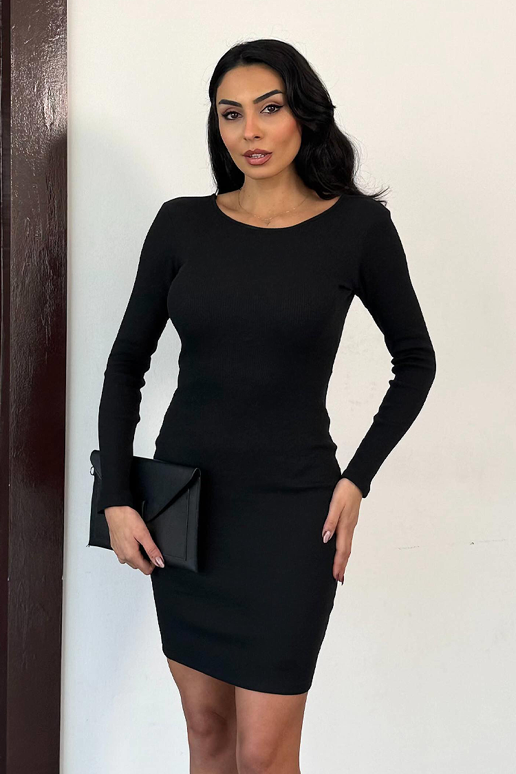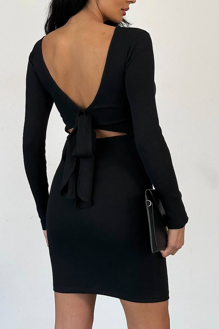 - За стилната си визия, изберете тази къса рокля с едноцветен десен и гол гръб.