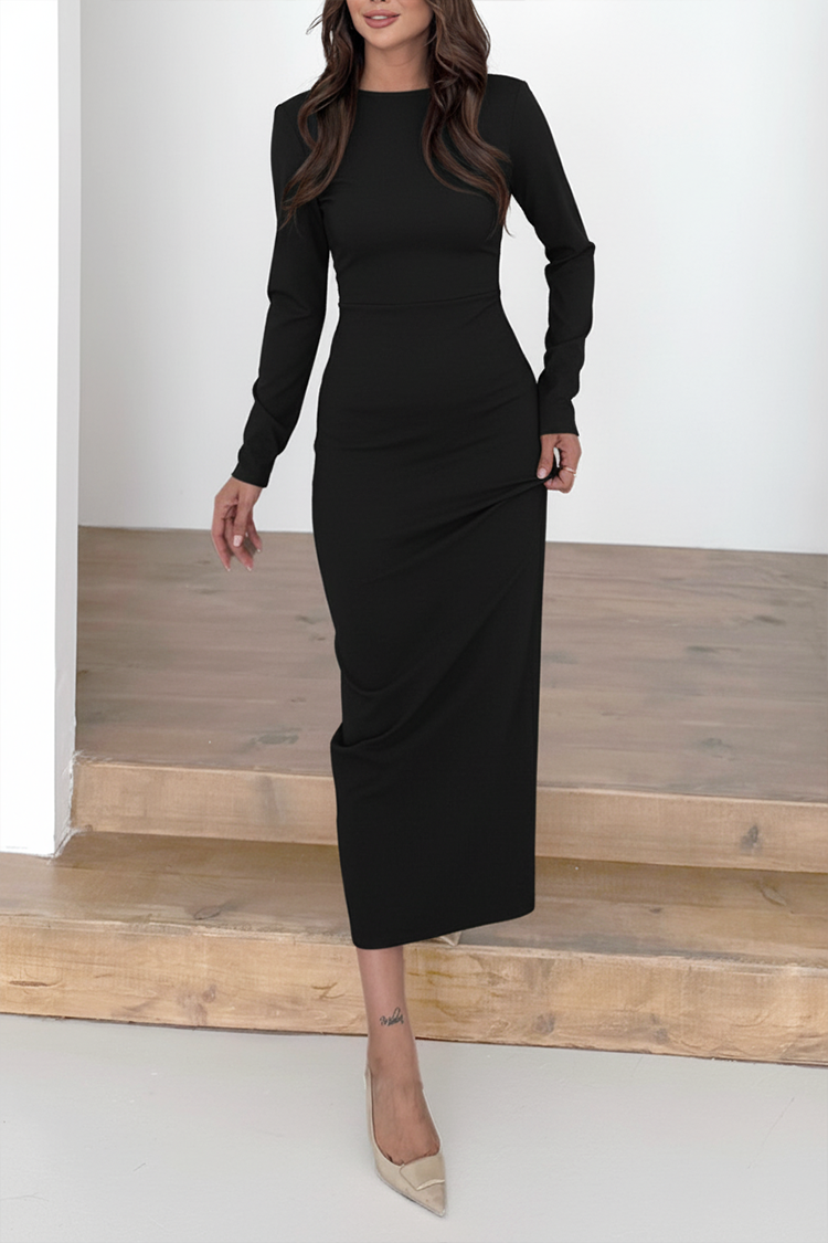 - Моделът е с вталена кройка, дълги ръкави , миди дължина и секси гол гръб с цип.
