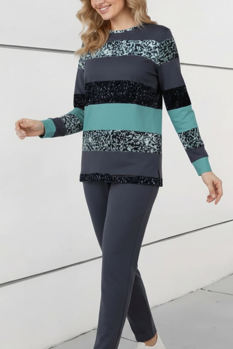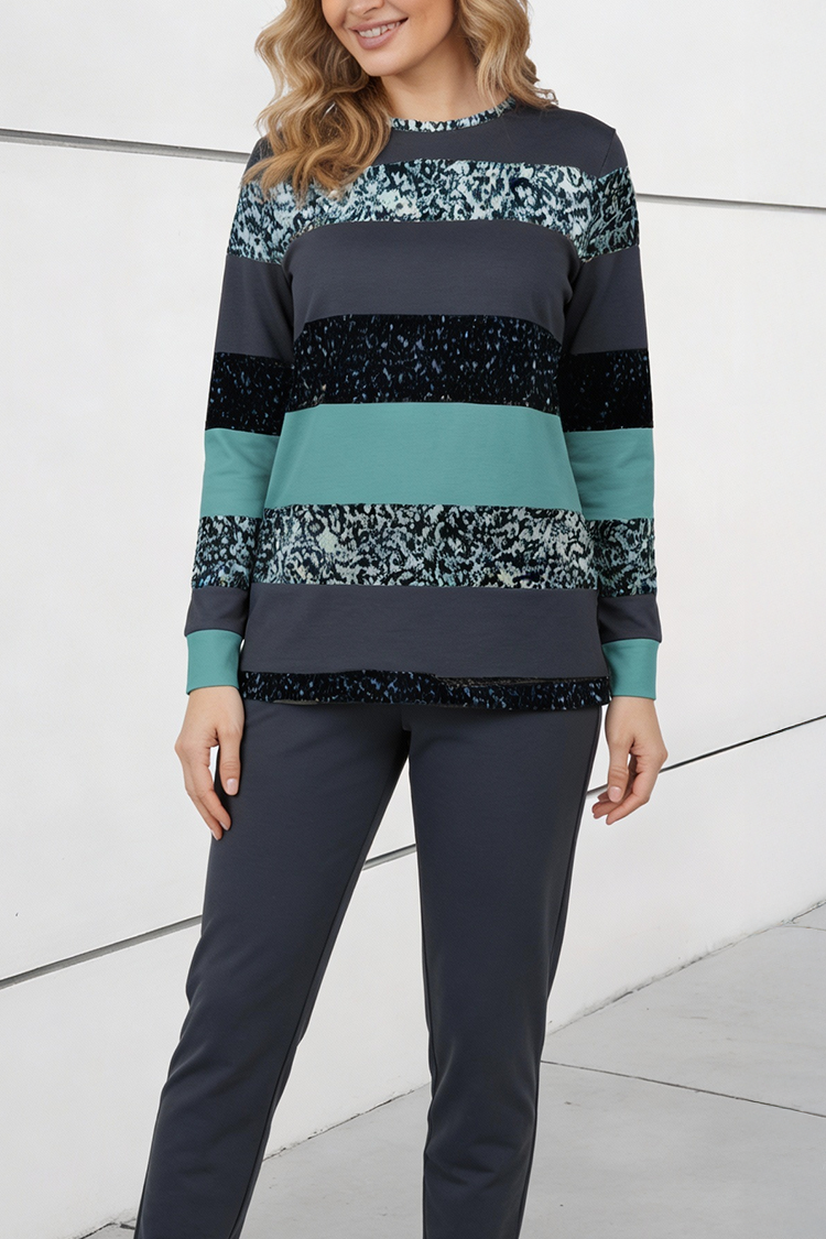 • Блузата е с обло деколте и свободна кройка, а панталонът - с висока талия и свободни крачоли.