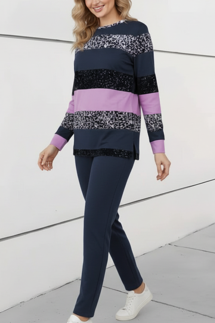 - Блузата е с обло деколте и свободна кройка, а панталонът - с висока талия и свободни крачоли.